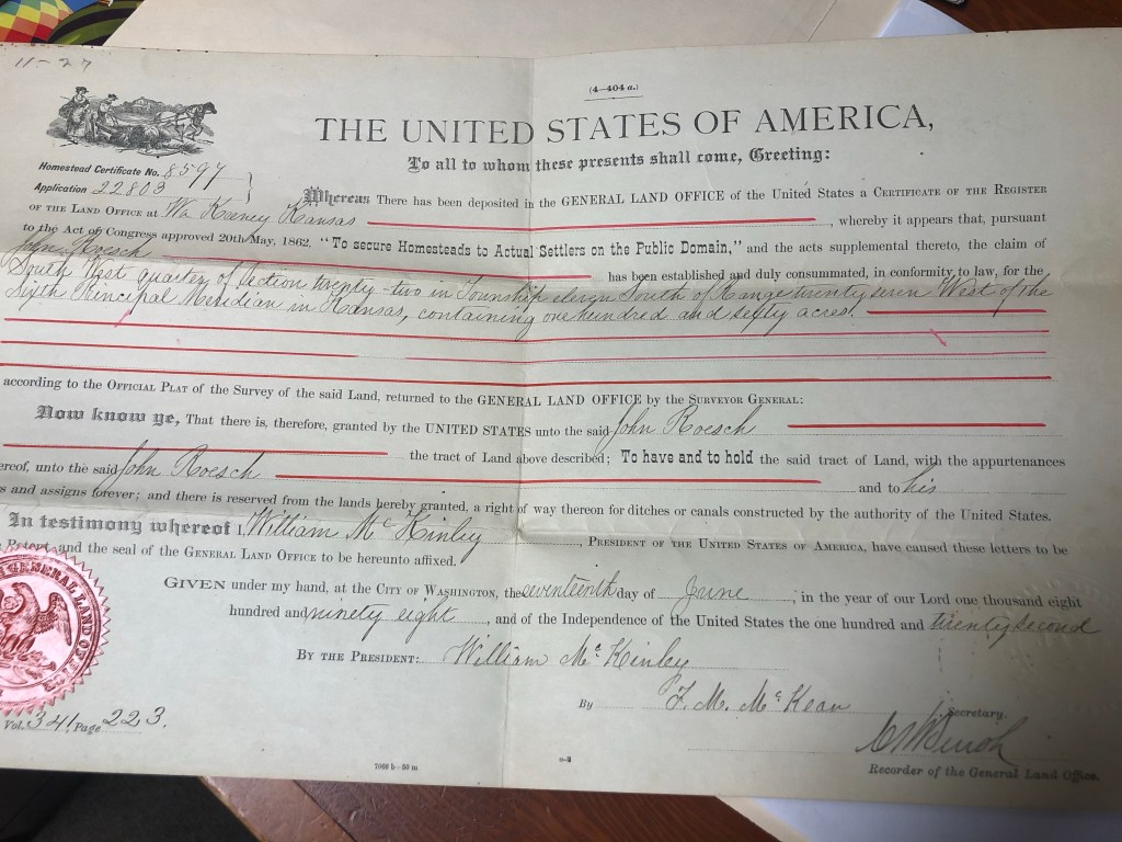 The Homestead Act of 1862 made 160 acres of public land available to every adult who chose to emigrate to the Plains territories and beyond. After payment of a ten dollar fee, the homesteader would get title to the land after he had “resided upon or cultivated the same for a term of five years.” One hundred and sixty million acres of government land or the public domain, typically called a homestead was given away free to 1.6 million homesteaders. The official document above was signed by President William McKinley.